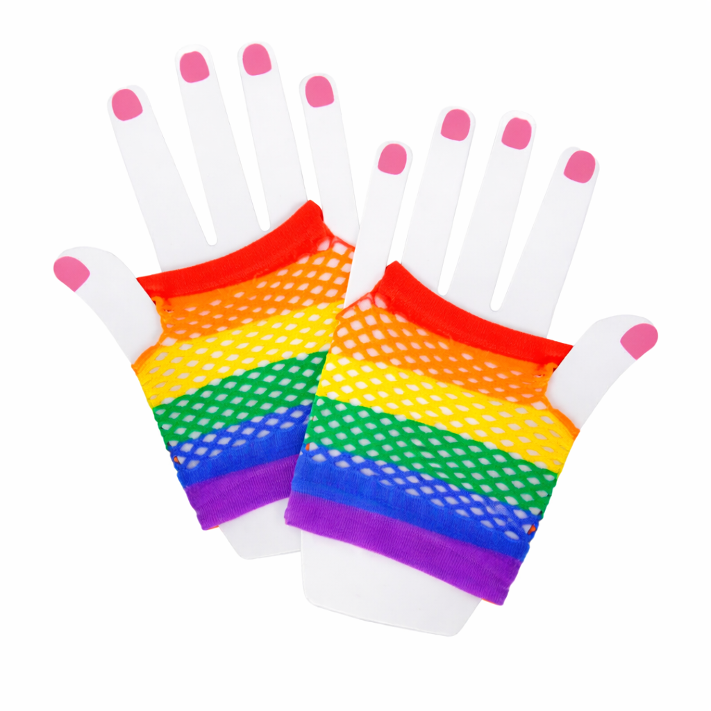 Add a pop of color to your sports carnival or colour run event with these vibrant fingerless rainbow fishnet gloves!
