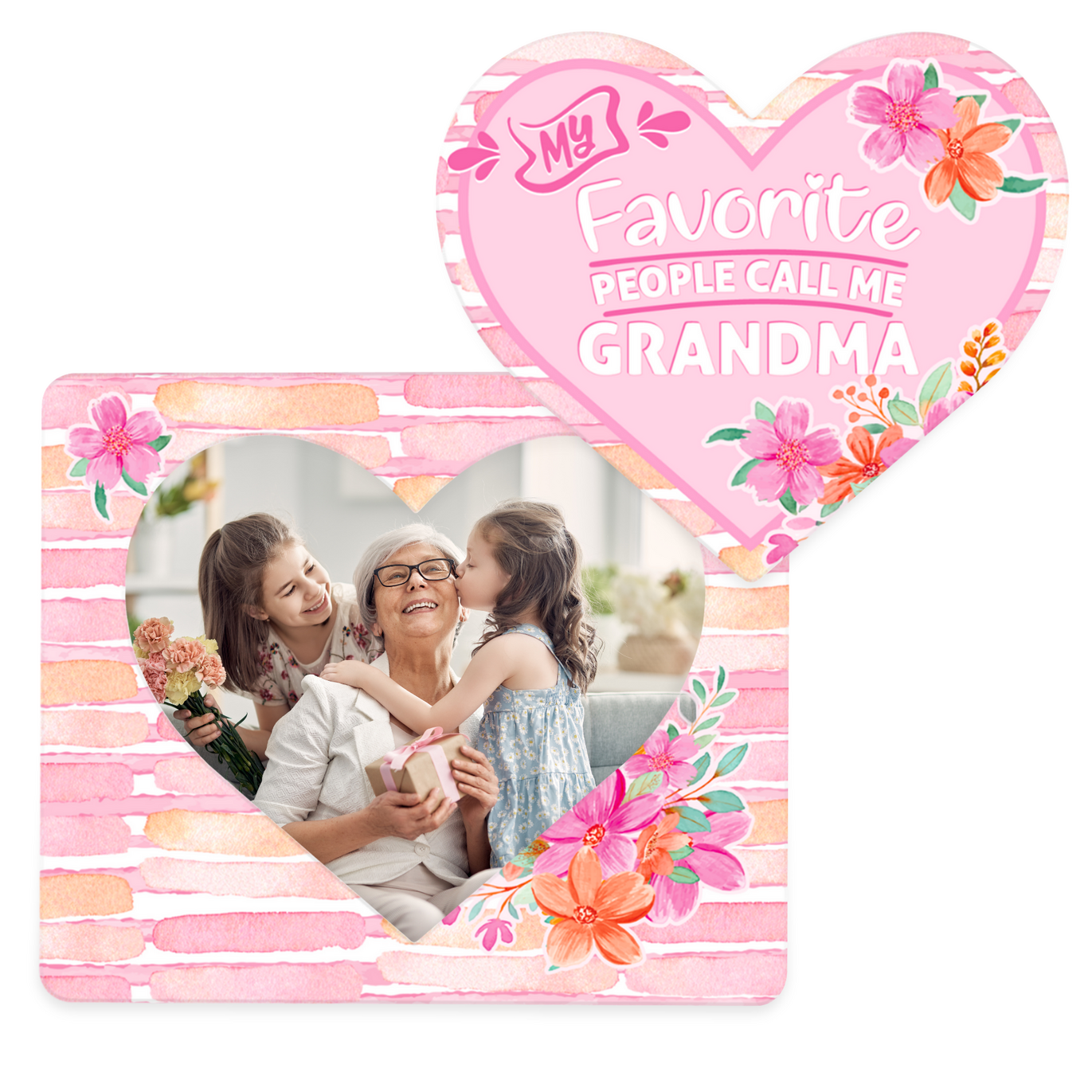 Celebrate the love only a grandma can give with this beautiful magnetic heart photo frame. Featuring the sweet message “My Favorite People Call Me Grandma” and a soft pink floral design, this frame is a heartfelt way to display a favourite family photo.