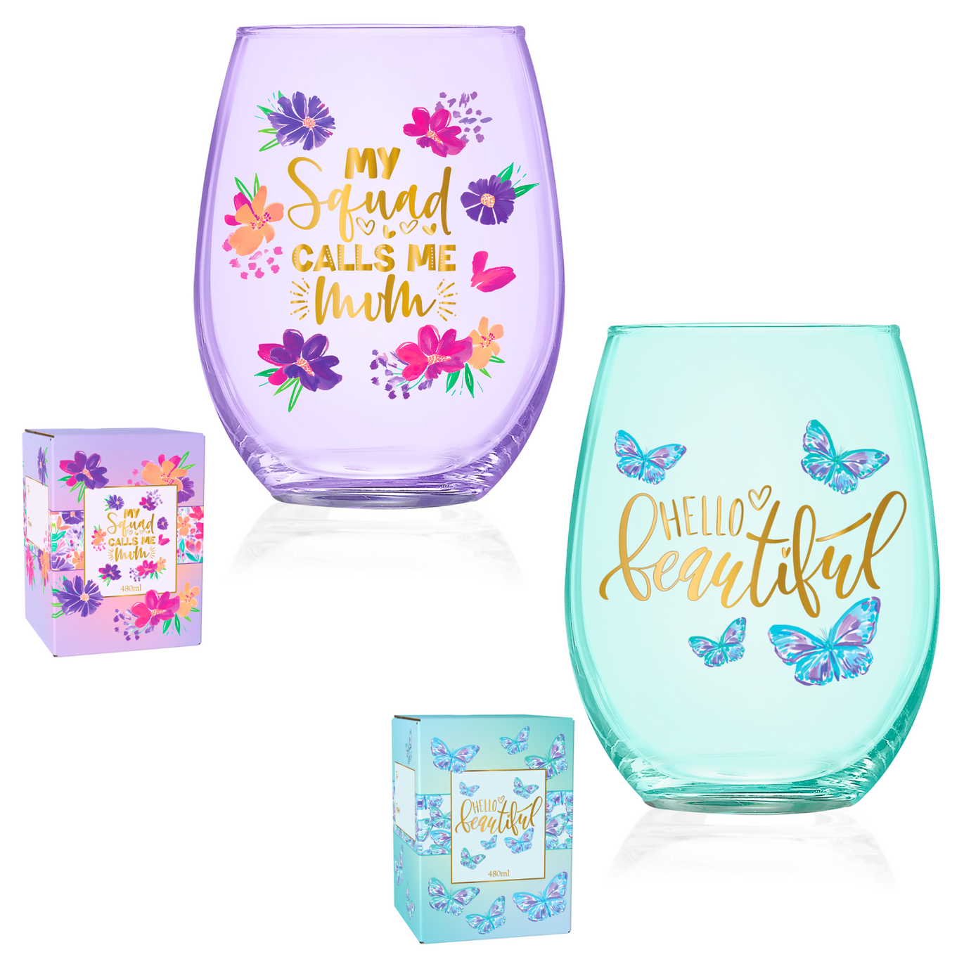 These decorated wine glasses are always a great gift! They are gorgeously packaged individually in a bright matching box with gold foil embossed print.