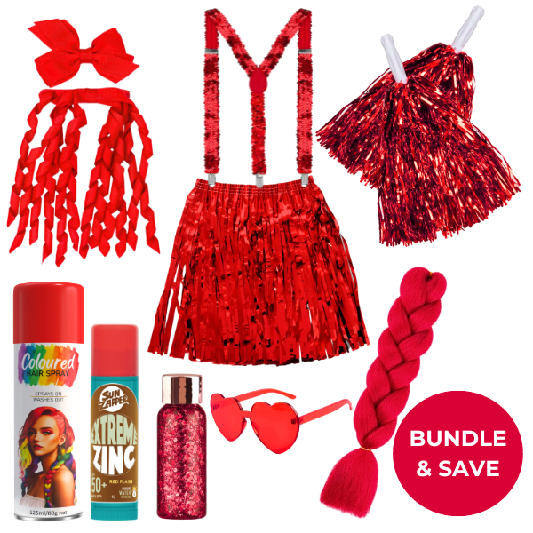 The Ultimate Red team cheer pack for your sports carnival day. Cheer on your red house or faction with all these athletics carnival accessories!